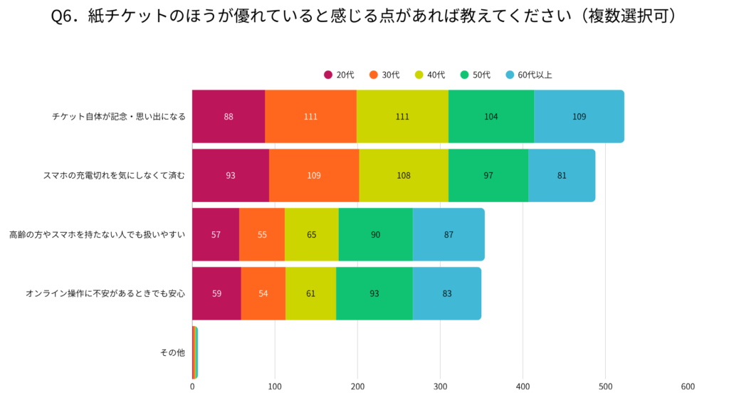 これらの結果から、紙チケットはイベントの記念品としての価値や、端末や通信環境に依存しない安心感、幅広い世代に対応できる扱いやすさといった点で、一定の支持を得ていることが分かります。
