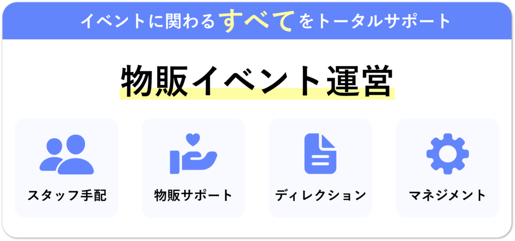 レジ機器の手配だけでなく、イベントそのものの「運営トータルサポート」も提供。企画・制作から当日の運営設計、スタッフ手配まで、イベントの特性や規模に合わせたサポートプランを一括で提案。さらに、物販ECや物流代行、イベントサイト制作など、終了後も含めた一連のプロセスをサポートすることで、「集客~販売~アフターセールス」までをワンストップで支援できる点が特長です。