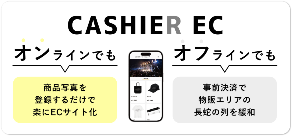 CASHIER EC は、イベント物販をオンラインと組み合わせて効率的に運営できる イベント特化型ECソリューション です。イベント専用ECサイトの導入により、当日の長蛇のレジ待ちを緩和し、来場者が落ち着いて商品を選べる購買環境を実現します。商品登録・画像登録、決済審査、ロジスティクスまで一括で代行できるため、主催者は最小限の工数で 事前販売・当日販売・事後販売 を含めた物販ECを運営できます。これにより、在庫ロスの削減や売上機会の最大化にもつながります。