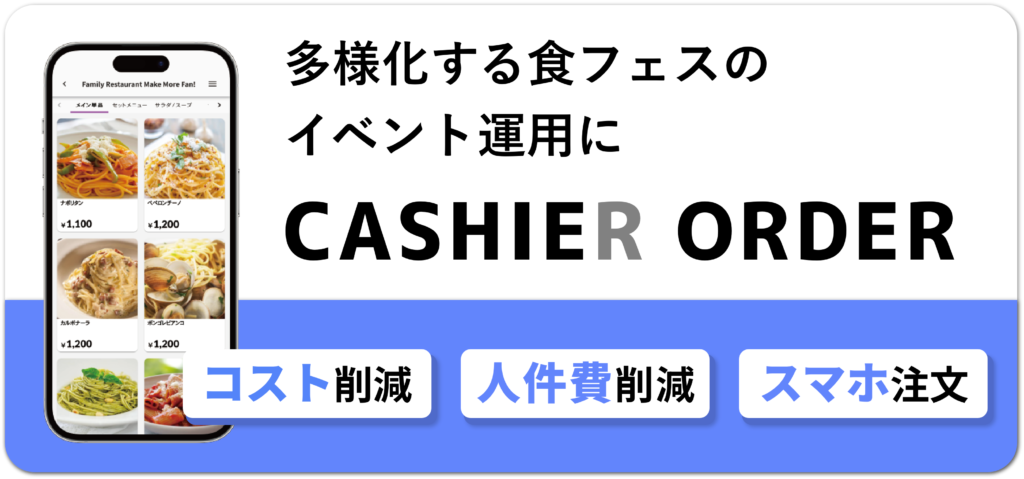 CASHIER ORDERは、来場者のスマートフォンやタブレット端末を活用して注文を受け付けるモバイルオーダー/テーブルオーダーシステムです。フードフェスや飲食ブースなどで、行列を作らずに注文・決済ができる導線を実現し、混雑緩和と売上アップの両立をサポート。スマホオーダー、テーブルオーダー、ハンディ端末入力、券売機連携など複数のオーダー方式に対応しており、イベントごとのレイアウトやオペレーションに合わせた最適な構成を選択可能です。飲食店向けに磨かれた便利な機能を、期間限定イベントでも活用いただけます。